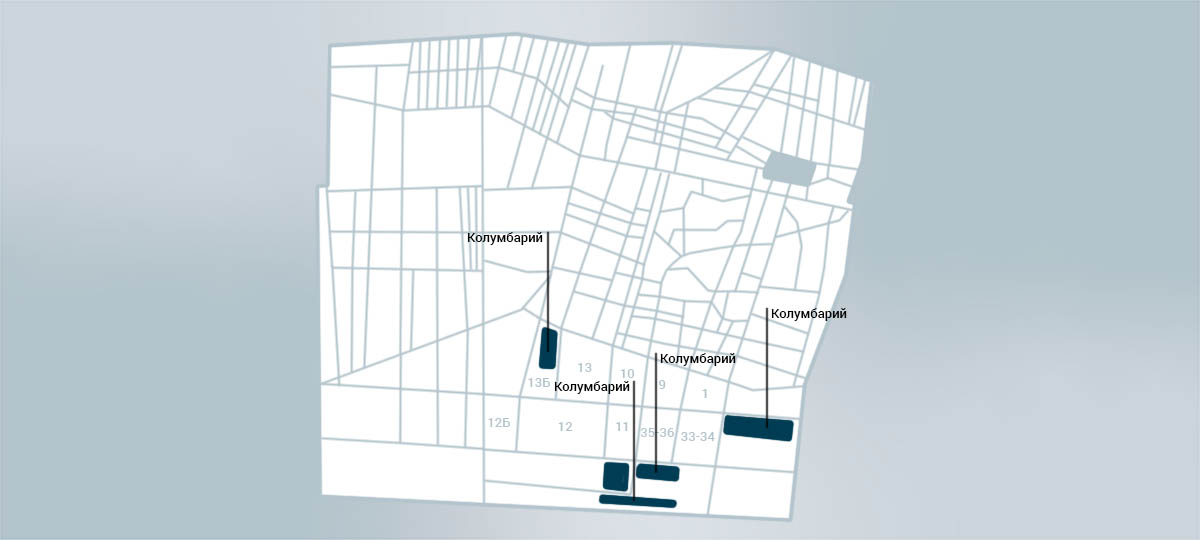 Ряд колумбарных стен размещён по левой стороне от главного входа, а горизонтальные колумбарии оборудованы по всей территории некрополя, расположенного по адресу: город Санкт-Петербург, улица Камская, 24.